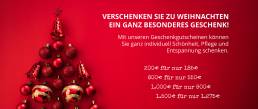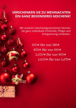 Egal ob Sie sich für eines unserer Verwöhnpakete oder einen individuellen Wunschbetrag entscheiden - Sie erhalten einen hochwertig gefertigten Gutschein, der sich auch ideal als Geschenk eignet.Weihnachtsaktionsbedingungen:- Aktionszeitraum unserer Weihnachtsrabattgutscheine bis 30.12.2025- Rabattgutscheine sind ausschließlich ab dem 07.01.2026 einlösbar- Rabattgutscheine sind nicht online zu erwerben sondern nur direkt persönlich im Salon